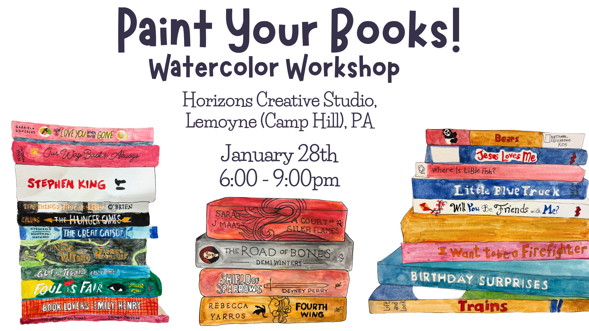 This beginner-friendly watercolor workshop will give you the opportunity to paint a custom stack of your favorite books! The class will begin with a lesson on the basics of watercolor, followed by instruction on techniques needed to paint your book stack.