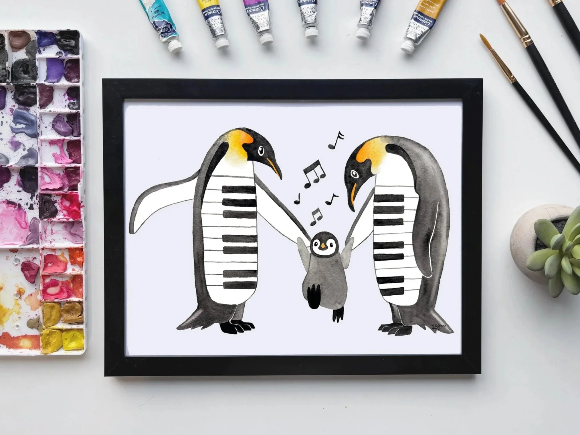 The Penguin Piano Musicians Greeting Card features two talented penguins performing a joyful duet. This playful watercolor design brings music and laughter to any note you send.